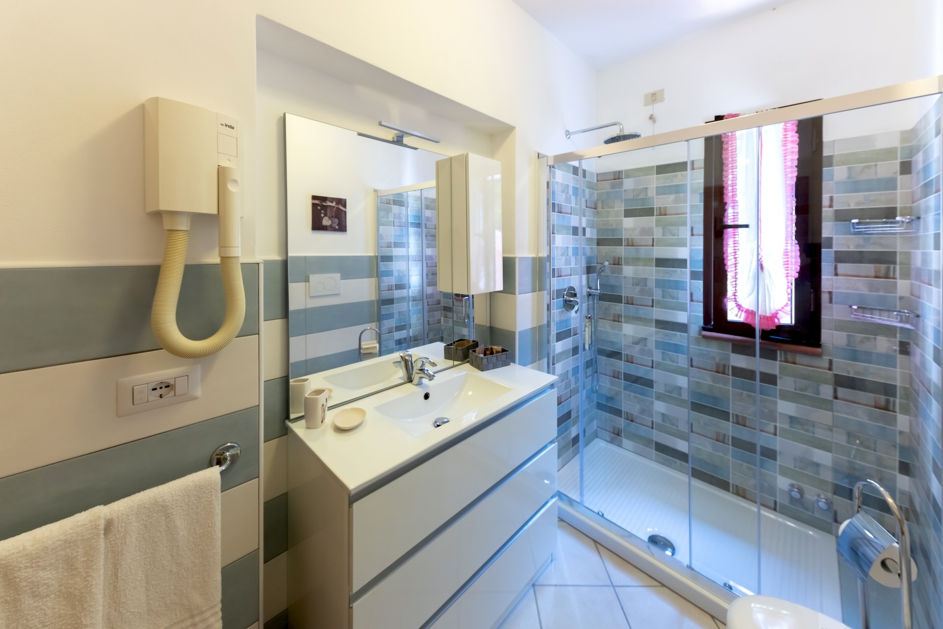 bagno con box doccia e phon asciugacapelli